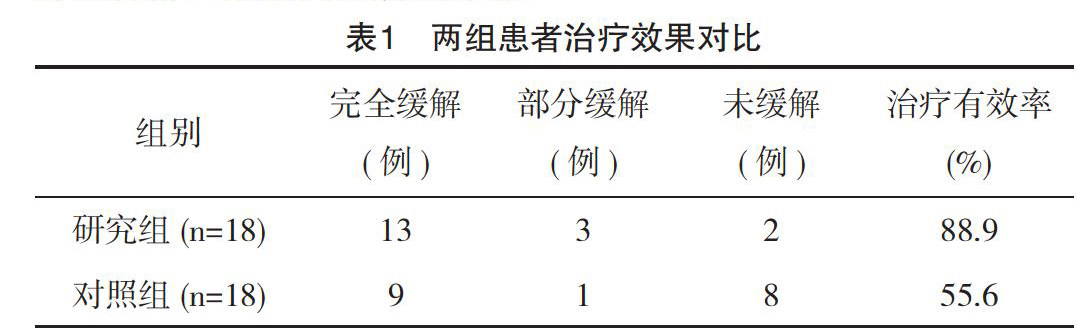 治疗疗程结束后,对照组的治疗有效率为55.6%,而研究组为88.9%,相比对照组有效率上升33.3%,比较差异有统计学意义(P<0.01),详见表1;对照组患者发生骨髓抑制5例,并发感染4例,过敏反应以及肺纤维化各出现1例,而研究组骨髓抑制2例,并发感染2例,无过敏性休克及肺纤维化的发生,研究组患者在治疗过程中不良反应发生率相对较低。