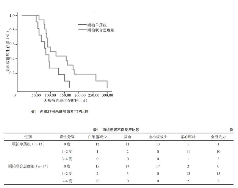 对照研究,发现这两种治疗方法的有效率分别为83.3%和50.0%,而且生存曲线上联合给药组PFS明显优于单纯化疗组,分别为5.3个月和4.5个月,比较差异有统计学意义(P<0.05)。
