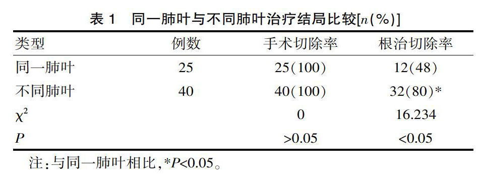 该组65例患者,两个癌灶组织学类型各异42例、两个癌灶组织学类型相同,但未在同一肺叶23例。癌症具体位置为:同一肺叶25例,不同肺叶40例,其中同侧28例、异侧12例。同一肺叶与不同肺叶手术切除率均为100%,但二者的根治切除率比较,差异有统计学意义(P<0.05)。见表1。