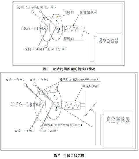 针对不能闭锁的现象,对CS6-1操作机构旋转闭锁圆盘的闭锁口,加宽5 mm(原来闭锁口尺寸6 mm,加宽5 mm后闭锁口为11 mm),真空断路器的锁杆能顺利地插入CS6-1机构的闭锁口(见图2)。